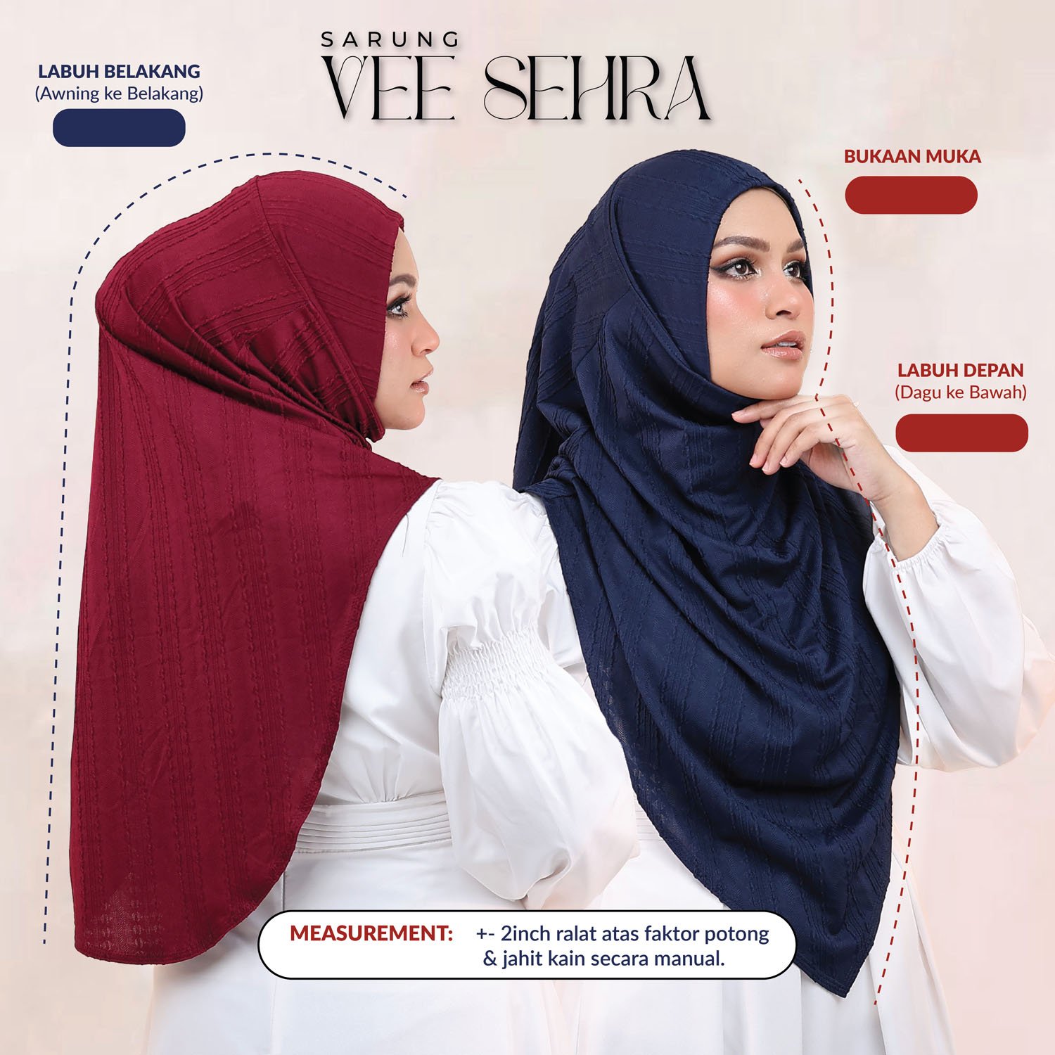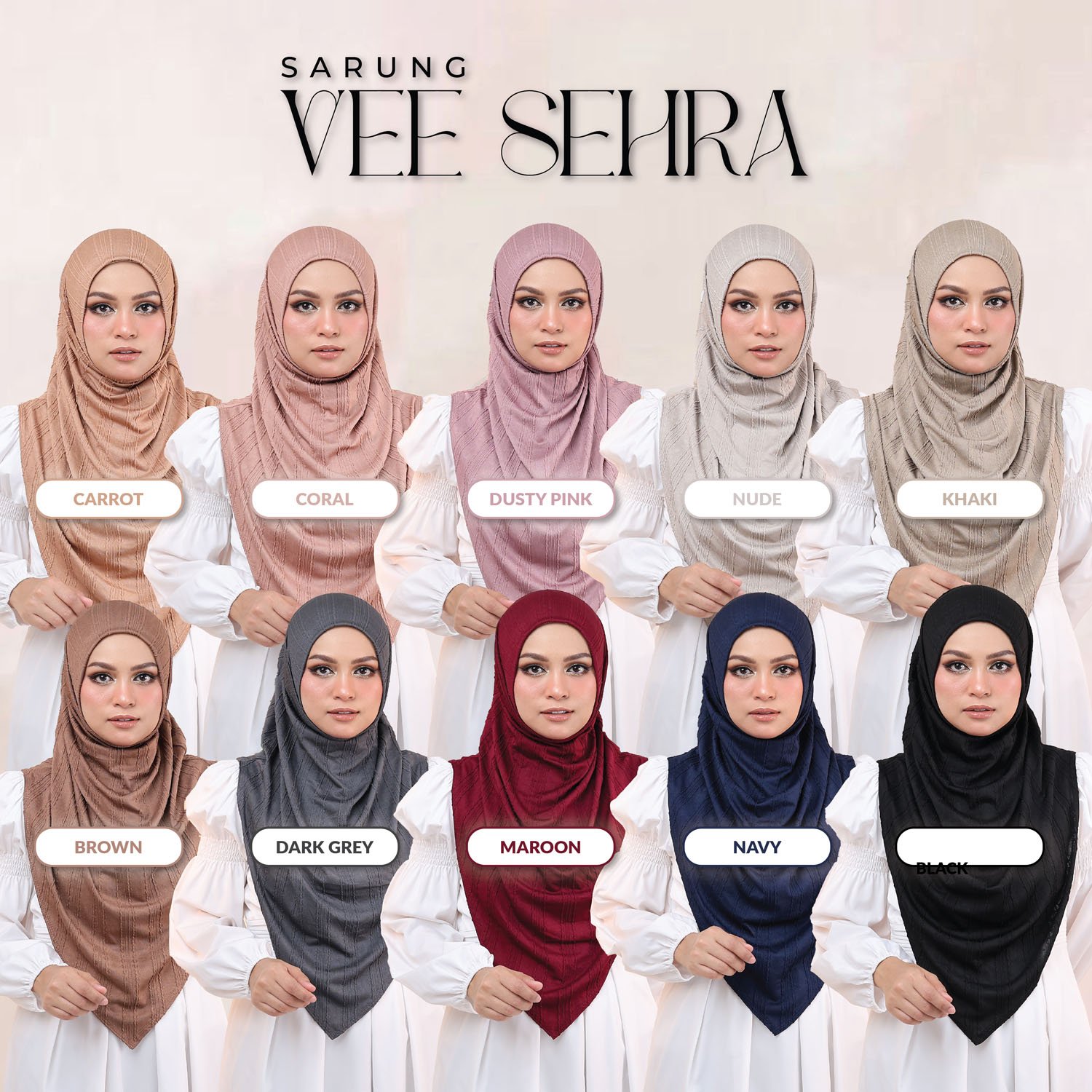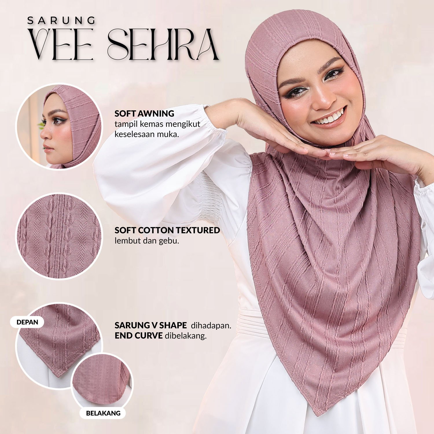 Sarung Sehra Vee hadir dengan kain bahan premium Jackward Cotton. la memberikan penampilan yang elegan dan sesuai untuk fashion Muslim. Sarung ini mudah dirawat kerana ia bebas dari seteri. Cocok untuk pengguna yang mencari hijab yang cantik dan praktikal.